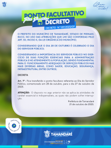 A Prefeitura de Tamandaré informa à população que, conforme o Decreto n.º 037/2025/GP, fica transferido o ponto facultativo referente ao Dia do Servidor Público, comemorado em 28 de outubro, para o dia 27 de outubro de 2025 (segunda-feira).
