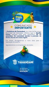 A Prefeitura de Tamandaré, por meio da Secretaria Municipal de Educação, informa que o Desfile Cívico, previsto para esta sexta-feira, 05 de setembro, foi cancelado devido à previsão de fortes chuvas em nossa região.