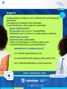 A Prefeitura Municipal de Tamandaré, por meio da Secretaria de Saúde e da Coordenadoria em Saúde da Mulher, informa que a laqueadura tubária pode ser solicitada por qualquer mulher a partir dos 21 anos de idade. O procedimento é garantido pela Lei nº 14.443/2022 e está disponível em nosso Município por meio da rede Regionalizada de Saúde.